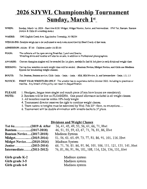 2026 SJYWL Championship 5045 English Creek Ave Egg Harbor Township, NJ |