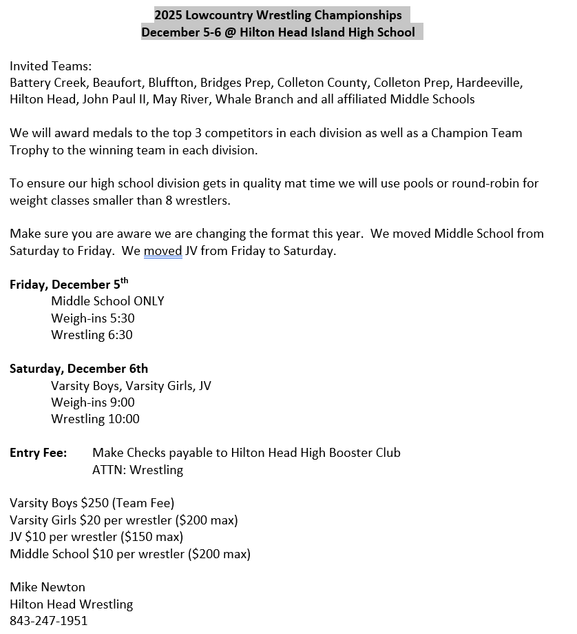 2025 Lowcountry JV Wrestling Championships - Hilton Head Hilton Head Island High School 70 Wilborn Road Hilton Head Island, SC 29926 |