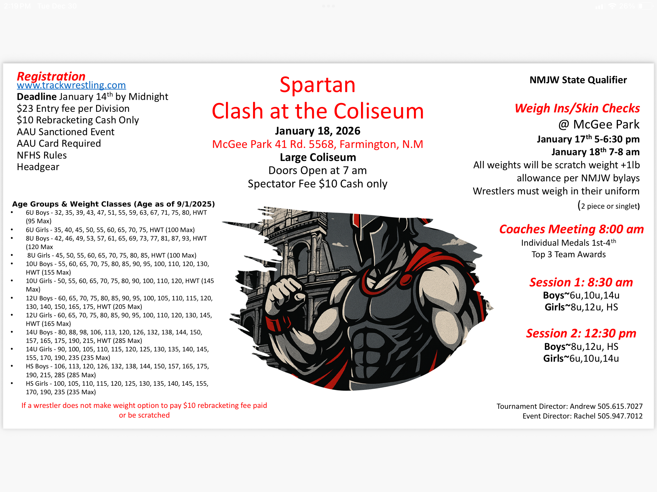 Spartan Clash at the Coliseum (AAU) McGee Park Large Coliseum McGee Park 41 rd 5568 Farmington, NM |