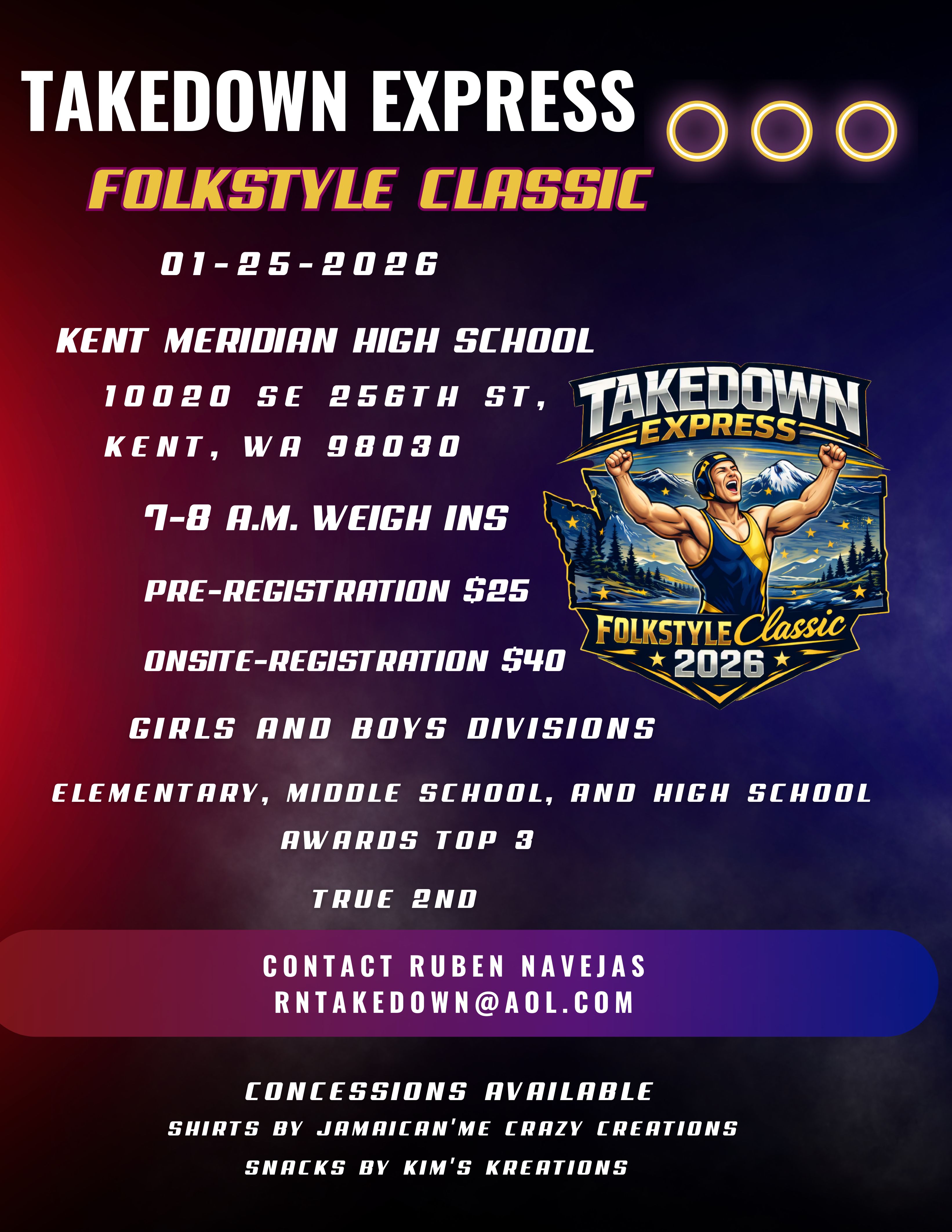 Takedown Express Classic (USAW) Kent Meridian High School 10020 se 259th st Kent, WA 98030 |