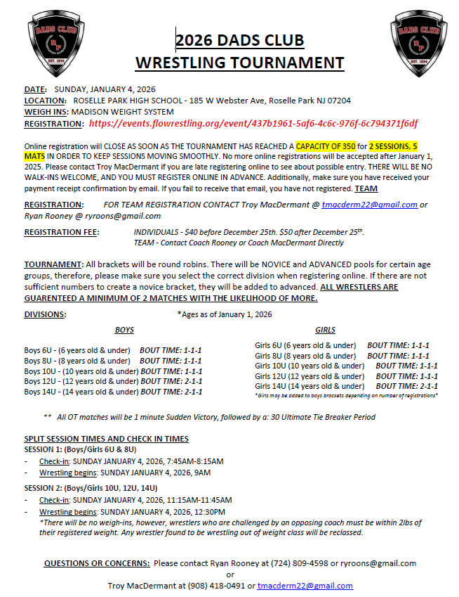 NJ-Dad's Club K-8 Tournament - 2026 Roselle Park High School 185 West Webster Avenue Roselle Park, NJ |