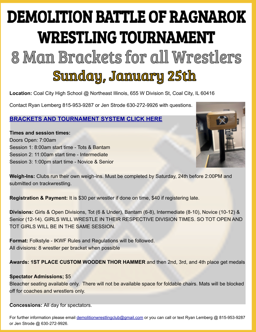 Battle of Ragnarok (USAW) Coal City Community High School 655 W. Division St. Coal City, IL 60416 |