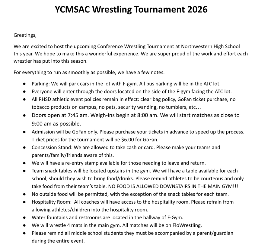 2026 YCMSAC Tournament - Sullivan Northwestern High School 2503 West Main Street Rock Hill, SC 29732 |